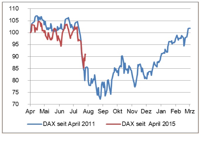 Chart 1: Vergleich der DAX-Kursverläufe ab April 2011 versus April 2015