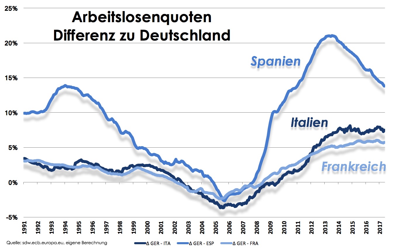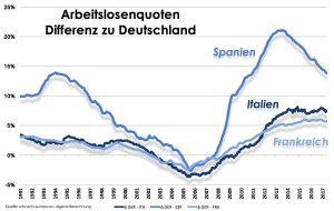 Aus deutscher Sicht käme eine moderate Anhebung der Zinsen in naher Zukunft sicherlich in Frage. Bei einem Blick auf andere größere Volkswirtschaften innerhalb der EU allerdings, würde ein Zinsschritt noch auf sich warten lassen. Interessant dabei ist eine Betrachtung der Differenz der Arbeitslosenquoten im Vergleich zu Deutschland. Während Spanien absolut gesehen zwar noch schlecht dasteht, konnte es seit 2014 diese Differenz sehr gut abbauen. Anders sieht dies in Italien und sogar Frankreich aus. Hier ist der Trend ungebrochen und die Differenz weiterhin hoch. In diesem Punkt betreibt die EZB gewissermaßen „Sozialpolitik“, von der sie nicht einfach abweichen kann.