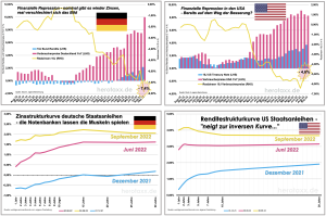Schauen wir uns die beiden Wirtschaftssysteme Deutschland und USA in Grafik 1 etwas genauer an. Beide Notenbanken, sowohl die EZB, als auch die FED haben in diesem Jahr Ihren geldpolitischen Kurs geändert. Die Einschätzungen zur transitorischen, also der vorübergehenden Inflation waren besonders bei der EZB dramatisch falsch. Während die FED innerhalb der USA recht frei agieren kann, wurden hier die Leitzinsen mittlerweile auf 3,25% angehoben. Gerade jetzt zeigt sich das größte Problem vor dem die EZB steht, da sie auf die einzelnen Verschuldungsgrade der EU Teilnehmerländer acht geben muss, während sie gleichzeitig die Inflation nicht ins Uferlose treiben lassen kann. Am kurzen Ende wurde also der Leitzins mittlerweile auf 1,25% erhöht während am langen Ende weiter aufgekauft werden muss. Hierzu hat die EZB am 21.07.22 das Anleiheaufkaufprogramm TPI (Transmission Protection Instrument) ins Leben gerufen, welches ähnlich wie das Pandemie Programm PEPP nun hochverschuldete Staaten vor zu hohen Zinsen schützen soll. Allein dies zeigt schon in welcher Verfassung die EU sich eigentlich befindet. So wird in Grafik 1 auch deutlich, dass es mittlerweile wieder einen nominalen Zins am deutschen Anleihemarkt gibt, dieser aber durch eine Inflation in Deutschland von 10% mehr als verzehrt wird. Die Realverzinsung fällt dabei weiter auf ihren Tiefststand bei -7,4%. In den USA ist man hier schon mindestens einen Schritt weiter. Für 10jährige US Staatsanleihen bekommt man inzwischen wieder fast 4%. Währenddessen stabilisieren sich die Verbraucherpreise. Die Attraktivität am Zinsmarkt nimmt damit in den USA kräftig zu. Jedoch merken die ersten Ökonomen schon an, dass die FED nicht das Zinsrad überdrehen soll. Ein Blick auf den Immobilienmarkt verheißt auch nichts Gutes. 30jährige Hypotheken stehen wieder über 6%. Auch in Deutschland geht ein Ruck durch den Immobilienmarkt. Hier darf kein zweites 2008 hinzukommen. Für Aktien bedeutet die Sicht auf Grafik 1, dass in Deutschland weiterhin das Prinzip TINA gilt (There is no alternative), während in den USA sich mittlerweile TARA (There are reasonable alternatives) unter die Anleger mischt.