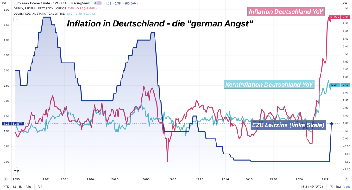 Angesichts der wirtschaftlichen Datenlage stehen die Vorzeichen auf Rezession. In den USA ist die Frage nach einem "Soft Landing" eher obsolet. Die OECD hat für beide Länder sowohl für 2022 als auch 2023 das BIP Wachstum kräftig revidiert. So soll das US BIP in 2023 um 0,5% wachsen und das deutsche BIP sogar um 0,7% schrumpfen. Den deutschen Mittelstand wird es dabei vermutlich besonders hart treffen. Der Anschlag auf Nordstream 2 in der Ostsee hat gravierende Folgen nicht nur im Hinblick auf die Gasversorgung im kommenden Winter. Auch wenn die europäische Außenpolitik nicht auf diplomatische Bemühungen in Richtung Russland aus ist, so gehen mit dem Wegfall von NordStream 2 weitere politische Optionen verloren. Grafik 3 verdeutlicht nochmal das große Inflationsproblem in Deutschland. Nicht nur die Energiepreise ziehen die Inflation in zweistellige Regionen auch die Kernrate (ohne Energie) steigt mittlerweile kräftig. Der sprunghafte Anstieg der Erzeugerpreise in den letzten Monaten zeigt, wohin die Reise hingehen könnte. Damit sind wir bei den Leitzinserhöhungen in der Eurozone wahrscheinlich noch am Anfang des Zyklus.