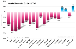 Zeitenwende könnte das Unwort des Jahres 2022 werden. Seit der Kanzlerrede Ende Februar wird in vielen Bereichen der Wirtschaft aber auch im täglichen Leben von bedeutenden Umschwüngen gesprochen. Dabei haben sich die Märkte auch im dritten Quartal des Jahres weiter negativ entwickelt. Das Besondere an der Wertminderung in 2022 ist, dass sie sich durch nahezu die gesamte Breite der Assetklassen zieht (Grafik 2). Alle Aktienmärkte stehen unter Druck. Hinzu kommt, dass durch die steigenden Zinsen auch die Rentenmärkte teilweise empfindlich Verluste hinnehmen müssen. Aber auch auf der Rohstoffseite ist nicht alles Gold, was glänzt. Sogar Edelmetalle konnten keinen signifikanten Wertanstieg verzeichnen. Im Gegenteil: Selbst Gold erleidet in USD gerechnet einen Verlust von ca. 9%. In Euro rechnende Anleger kamen hier immerhin noch auf einen Gewinn von ca. 6%. Wie bei Aktien drückt auch bei Rohstoffen der negative Konjunkturausblick die Kurse. Und auch wenn wir in Deutschland die größte Inflationswelle seit dem zweiten Weltkrieg erleben, klingt es fast schon unglaublich, dass die meisten Rohstoffe sich seit dem 24.02.22, dem Beginn des Ukrainekrieges z.T. um 25% - 30% (Kupfer und Baumwolle) verbilligt haben. Hier läuft der schwache Euro allerdings gegen uns.